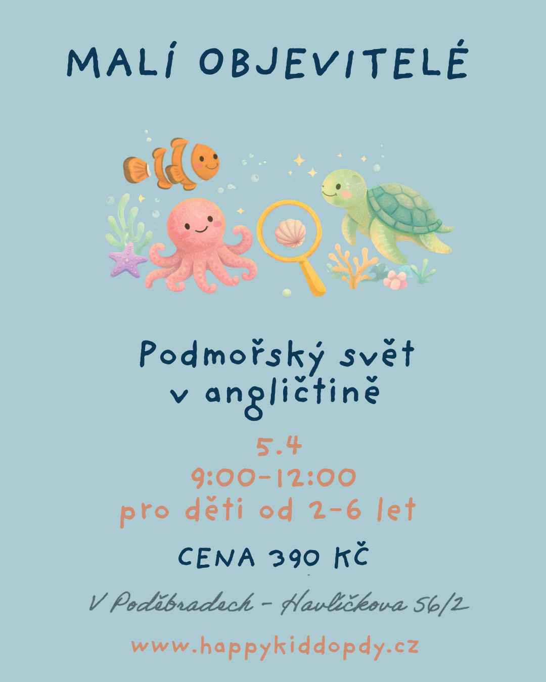 Přijďte s dětmi objevovat kouzlo podmořského světa – hravě, v klidu a bez spěchu. Přirozeně u toho nasají první anglická slovíčka a fráze.